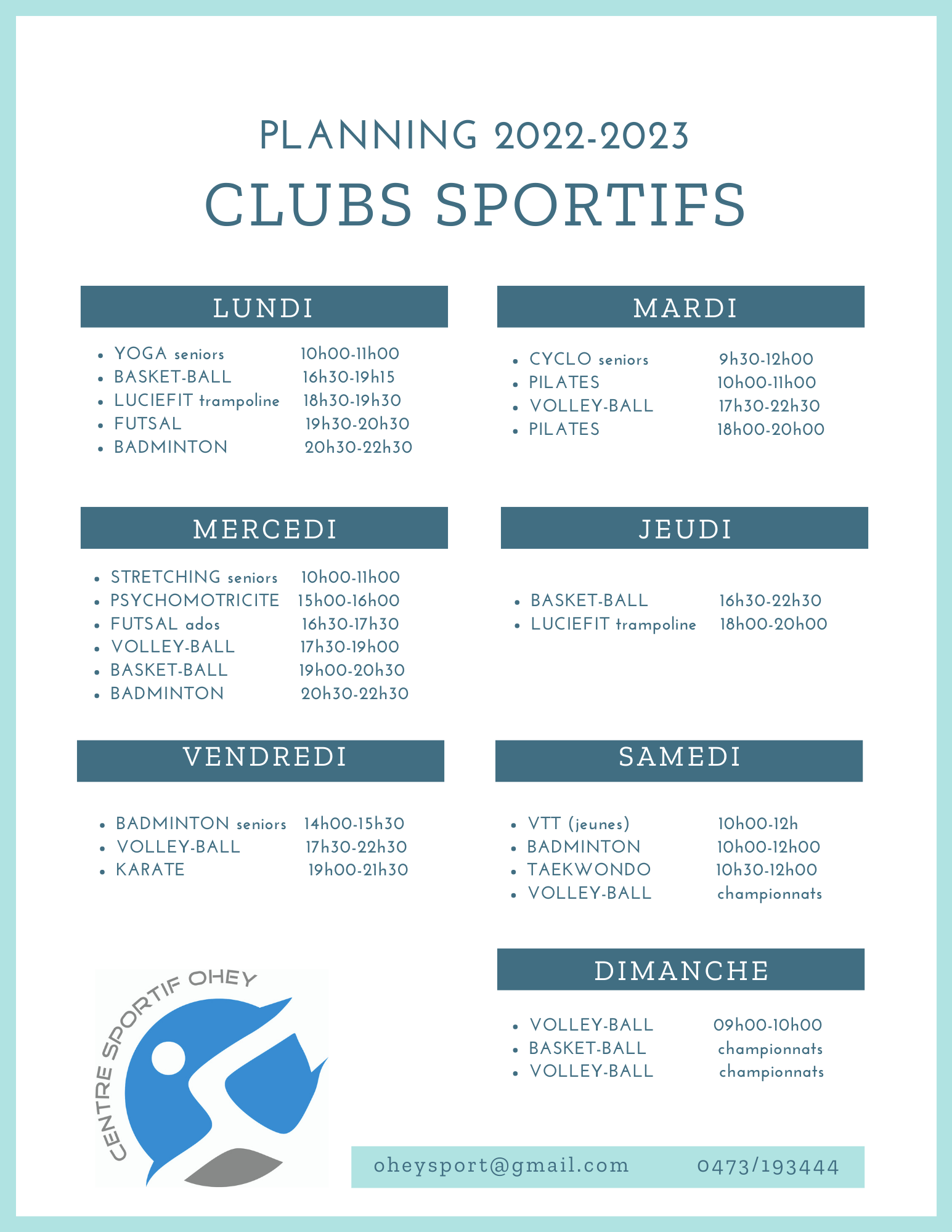 L'ensemble des plannings et contacts des occupants du Centre Sportif pour cette saison 2022-2023 VOLL'OHEY: